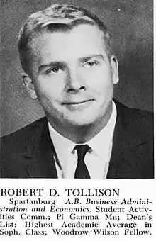A native of Spartanburg, South Carolina, Tollison attended local Wofford College where he earned an A.B. in business administration and economics in 1964. He completed an M.A. in economics at the University of Alabama a year later.[1] After completing his master's in Tuscaloosa, Tollison moved to Virginia to begin teaching at Longwood University, then called "Longwood College." Shortly thereafter he commenced work on his Ph.D. in economics at the University of Virginia. He finished his doctoral degree in 1969.[1]