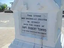 The Balmain Cemetery closed in 1912 and, in 1941, it was decided to convert it into parkland (the Pioneer's Memorial Park) and advertisements were placed for families to make arrangements for re-interment of bodies or removal of memorials. As a result, the memorial stone from Robert Towns' grave was relocated to stand atop a monument at Castle Hill, Townsville.[55]