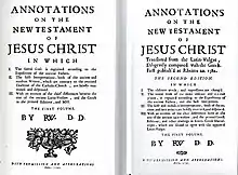 - Annotations on the New Testament of Jesus Christ, in which, 1. The literal sense is explained according to the Expositions of the ancient Fathers. 2. The false Interpretations, both of the ancient and modern Writers, which are contrary to the received Doctrine of the Catholic Church, are briefly examined and disproved. 3. With an Account of the chief differences betwixt the Text of the ancient Latin Version and the Greek in the printed Editions and Manuscripts, [Douay], 1730, 2 vols. This work contains a translation of the New Testament. The preface was reprinted in the appendix to Rhemes and Doway (1855) by Henry Cotton, the annotations at Manchester in 1813 in Oswald Syers's Bible. A reply appeared under the title of Popery an Enemy to Scripture (1736), by James Serces, vicar of Appleby, Lincolnshire.