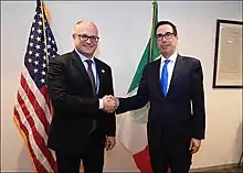 In August 2019 tensions grew within the populist government, leading to the issuing of a motion of no-confidence on Prime Minister Giuseppe Conte by the League.[24] After Conte's resignation, the national board of the PD officially opened to the possibility of forming a new cabinet in a coalition with the M5S,[25] based on pro-Europeanism, green economy, sustainable development, fight against economic inequality and a new immigration policy.[26] The party also accepted that Conte may continue at the head of a new government,[27] and on 29 August President Sergio Mattarella formally invested Conte to do so.[28] On 5 September 2019 Gualtieri was appointed Minister of Economy and Finance.[29]