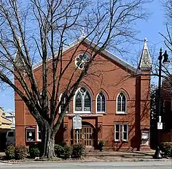 Roberts Memorial United Methodist Church is a two-story, brick, vernacular Gothic Revival structure. Constructed in 1834, it is located south of King Street in the 600 block of South Washington Street, sandwiched between the historic Black neighborhoods of ‘the Bottoms’ and ‘Hayti’. The church fronts South Washington Street to the west, with an ornate facade of decorative brick and stained-glass windows. Although the present narthex, façade and most of the stained glass were added during extensive remodeling in 1894, the side walls of the 1834 building remain, and include the original window openings and denticulated brick cornices.[16]