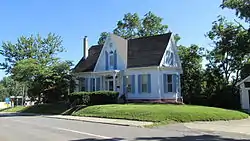Built of weatherboarded walls on a foundation of sandstone, the Robinson-Pavey House is covered with an asphalt roof and features elements of wood and iron.[3] Among the prominent architectural elements of this Gothic Revival house are elaborate bargeboards at the ends of its tall gables; the roof is steeply pitched, and the house's shape is broken by a small "side" gable that includes a shutter-covered ogive window over the main entrance. Piercing the walls are two doors, both of which possess small but elaborate hand-carven trim and brackets.[2]