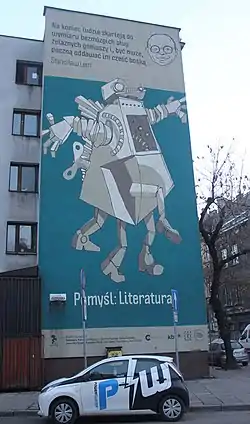 A mural in Kraków depicts a typical grotesque fabular robot, with a quotation from Dialogs: "Eventually the humans will dwarf down to the level of brainless servants of iron geniuses and may be even start to worship them as Gods". The mural was created by Filip Kużniarz in 2012. [7]