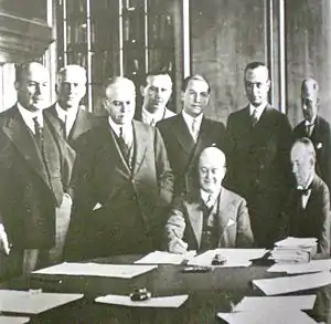 On 1 May 1933, they concluded a bilateral treaty known as the Roca-Runciman Treaty.[2] The Argentine Senate ratified this agreement by Law #11,693. The treaty lasted three years and was renewed as the Eden-Malbrán Treaty of 1936, which gave additional concessions to Britain in return for lower freight rates on wheat.[3]