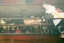 At Ultimate Jeopardy in March 1994, the Public Enemy teamed with Shane Douglas and Mr. Hughes to face Sullivan, the Tazmaniac, Road Warrior Hawk, and ECW Heavyweight Champion Terry Funk in an "Ultimate Jeopardy steel cage match". Each participant had a stipulation which would be implemented if they were defeated; if the Public Enemy were defeated, they would be forced to stop teaming together. Douglas won the bout for his team by pinning Funk.[9][10][11] At When Worlds Collide in May 1994, the Public Enemy again teamed with Douglas and Hughes, losing to J. T. Smith and the Bruise Brothers in a handicap elimination match.[8] At the same event, the Public Enemy attacked Terry Funk after being paid by Paul E. Dangerously (the manager of Funk's rival Sabu), causing Funk to declare he would get revenge on the Public Enemy.[10][12][13] At Hostile City Showdown in June 1994, the Public Enemy wrestled Terry Funk and his brother Dory Funk Jr. to a no contest. At Heat Wave: the Battle for the Future in July 1994, the Public Enemy defeated the Funk brothers in a barbed wire match. At Hardcore Heaven in August 1994, the Public Enemy successfully defended their titles against the Bad Breed.[8] Later that evening, the Public Enemy interfered in the main event bout between Terry Funk and Cactus Jack. As the four men brawled, Funk called for a fan to toss him a steel chair. This resulted in multiple fans hurtling chairs into the ring, with Rock and Grunge being buried under a large pile of steel chairs.[14][15]