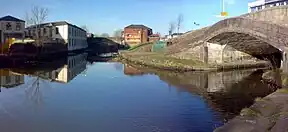 On the east bank above the arm, the towpath in 1851 was flanked by Moss Hall Mill, a cotton spinning mill with a boilerhouse to the north, and Gibralter Cotton Mill.[5] Both had become Moss Hall Cotton Mill by 1892, a bakery and jam manufactory by 1910,[7] and warehousing by 1930.[8] Beyond was Halfpenny Bridge, although not named as such in 1851, and the twin-tracked railway bridge. Sandwiched between them was Lark Corn Mill on the west bank and Oldham Road Cotton Mill to the east.[5] By 1892, the cotton mill was disused, and the site of the corn mill had been cleared. Halfpenny Bridge is clearly labelled as such. It was a footbridge, and the steps leading up to it on the west bank, and another set leading down from the road to the towpath on the east bank can be clearly identified.[6] The Grecian Emery Works had appeared on the east bank by 1910,[7] and was still operating in 1930.[8]