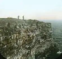 The Magdalen Islands have recorded over 400 shipwrecks in four centuries.[13] The Rochers aux Oiseaux is the closest island in the archipelago to the Laurentian Channel, making it an ideal site for a lighthouse. In 1860, John Page, an engineer with the Department of Public Works, proposed the construction of a lighthouse on the rock, noting that the project would be one of the most difficult the department would ever undertake. The lighthouse and adjoining buildings were built in 1870. Materials were transported from a path carved into the rock.[14] The first lighthouse was a 15.2-metre-high wooden building. It was rebuilt in 1887 to a height of just 11.9 metres. After being raised to a height of 15.2 meters in 1908, it was finally demolished and replaced by a new concrete lighthouse in 1967, automated in 1988.[15] Access to the lighthouse was by boat and a 147-step staircase on the north side of the rock.[14]