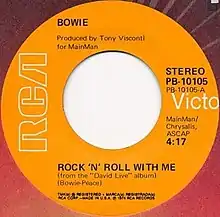While the song "Knock on Wood" from David Live was issued as a single in the UK, "Rock 'n' Roll With Me" was chosen for release as the US single (RCA PB 10105) in September 1974, in response to Donovan's recent cover version.[4] The B-side in each case was another live recording from the Diamond Dogs tour, "Panic in Detroit", originally from Aladdin Sane (1973). An edited version was issued on a US promotional single (RCA JB 10105) that same month.