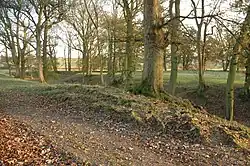 A moat was usually created as a status symbol, around a domestic or religious building, rather than for practical defence. The reason for this moat is not known.[1] In a description of the village in 1924, for the Victoria County History series, it was thought to be possibly the site of a cattle enclosure.[2]