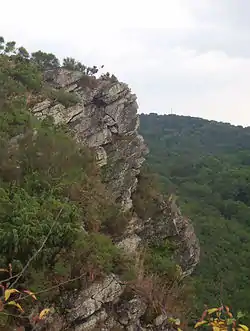 The reputation of this precipice is founded on its breathtaking sheer drop: 118 metres (387 ft).[1] Neither tourists nor locals expect this kind of natural feature in Normandy. It is considered the most mountainous part of the region, even though not the highest, and it has become, over time, one of the main attractions in Normandy. It is also a popular lookout that gives a broad survey of the wooded groves of the Rouvre, the fast-flowing river in the valley, which can be reached by steps hewn from the rock. The natural surroundings are full with granite rocks, ravines, heath and thicket. Many visitors come to find a calm place for their contemplation and meditation.