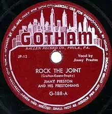 "Rock the Joint", also known as "We're Gonna Rock This Joint Tonight", is a 1949 boogie song recorded by various proto-rock and roll singers, notably Jimmy Preston and early rock and roll singers, most notably Bill Haley in 1952. Preston's version has been cited as a contender for being "the first rock and roll record", and Haley's is widely considered the first rockabilly record.[2]