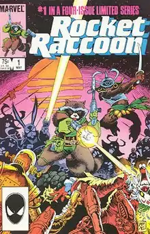 Rocket Raccoon first appeared in Marvel Preview #7 (Summer 1976), in the back-up feature "The Sword in the Star", under the name "Rocky".[5][6] He would next appear in The Incredible Hulk #271 (May 1982), where it is learned that "Rocky" is short for "Rocket". In 1985, he received his own four-issue limited series and in an afterword to the first issue, Mantlo himself asserted that this was the same character seen in Preview, penciled by Mike Mignola and inked by Al Gordon with Al Milgrom. Rocket appeared in Quasar #15 in 1990 and later appeared in three issues of Sensational She-Hulk in 1992 (#44–46).[4] The character only appeared in a total of ten comic books in his first thirty years of existence.[7]