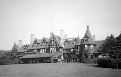 Rockhurst was built on Bellevue Avenue at Rough Point Newport, Rhode Island in 1891 for Mrs. H. Mortimer Brooks by Peabody and Stearns.[1] The Châteauesque style exterior featured rounded towers with candlesnuffer roofs flanking a central block with an open arcaded gallery along the second story.[2] It was made of farm stone and wood shingles.