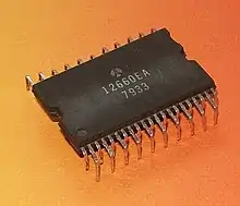 The CPU, part number 10660,[lower-alpha 1] was packaged in a 42-pin quad in-line package. The pins included a 12-pin address bus, 8-pin data bus and three 4-pin input/output ports that could be combined in different ways. Power supply and clock signals took up the rest of the 42-pins.