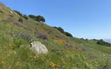 Rocky Ridge is host to a number of different habitats typical of the California Coast Ranges. In lower elevations and in the valleys emanating from the ridge, there is extensive coverage of California mixed evergreen forest with Coast Live Oak, Valley oak, California Buckeye and California Bay[10] being the dominant tree species. In riparian areas, Big-leaf maple and white alder are common alongside the regular suite of oaks. Higher in elevation, the ridge is dominated by chaparral and annual grassland (sp. Avena, sp. Bromus).[10]