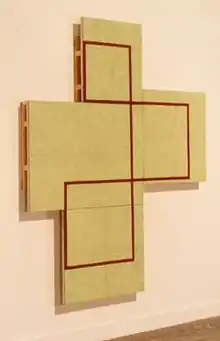 Carswell began constructing visible support armatures that jutted into three-dimensional space, giving paintings like St. Tropez (1978) a commanding sculptural presence.[31][9] In New York, he continued to develop these structures while also shifting to a thicker, built-up and scraped-down surface application of oil paint and wax (encaustic).[6][4] By the late-1980s, he achieved his mature style in works like Black and White Cross Encircled by Red (1988), employing a spare lexicon of emblematic forms (crosses, semicircles, squares, rectangles), thick exposed supports, interlocking planes and shaped or assembled canvasses, that he painted in vivid, unmodulated colors with rich, layered surfaces.[6][32][8] His formal experimentation would include geometric openings or holes that pierced the canvasses—"diagramming" paintings by revealing their construction and relationship with the walls behind them as he did in Two Grays and Orange Around an Empty Rectangle (1988)[7][33]—or displaying both backs and fronts of painted panels, as in 3 (5) Panels, Presented and Reversed (1993).[8] Carswell described these works as "integrated pictorial objects [...] at once physical and logical, ephemeral and phenomenal."[32]