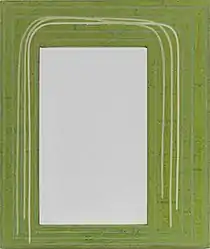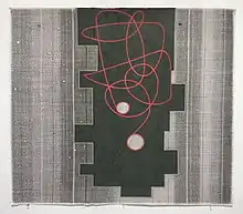 Critics, such as Judith Russi Kirshner, have frequently commented on this sense of in-between spaces and paradoxes in Carswell's work of this period, for example, calling it "an ambiguous balance of object and image," or in curator Terrie Sultan's case, identifying a "call-and-response" between accidental painted effects and deliberate, geometric compositional strategies.[9][7] Others noted the push-and-pull between the arresting, unitary gestalt of iconic geometry and the seductive, almost decorative surfaces.[6][4][5] Artforum's James Yood suggested that Carswell's "wry sequences of subtle dislocation" skewed his geometric abstract language just enough to keep his compositions "tense and expectant."[34] David Pagel concluded that Carswell's "randomly off-balanced and rigorously geometric" configurations were profoundly resistant to rational explanation, calling them "tight organizations that defy logic yet make sense."[4]