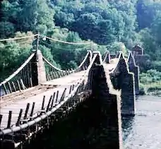 Roebling's Delaware Aqueduct, also known as the Roebling Bridge, is the oldest existing wire suspension bridge in the United States.[1] It runs 535 feet (163 meters) over the Delaware River, from Minisink Ford, New York, to Lackawaxen, Pennsylvania. Opened in 1849 as an aqueduct connecting two parts of the Delaware & Hudson Canal (D&H), it has since been converted to carry automotive traffic and pedestrians.
