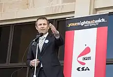 At the 2008 state election, Cook won the seat of Kwinana in a tightly fought contest, winning by 300 votes from independent candidate Carol Adams, the mayor of the City of Kwinana.[5] Adams had unsuccessfully attempted to gain Labor pre-selection, and later accused Alan Carpenter of "parachuting" Cook into the seat.[6] On 16 September, ten days after the election, Cook was elected to the position of deputy leader of the Labor Party under Eric Ripper.[7] He is a member of the Labor Left faction, backed by the United Voice trade union (previously known as the Liquor, Hospitality and Miscellaneous Union).[6] After Ripper was replaced by Mark McGowan as leader of the opposition in January 2012, Cook maintained his position as deputy leader.[8] He was re-elected at the 2013 state election in a rematch with Adams, winning an increased majority.[1]