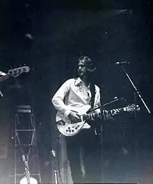 After the break-up of the Byrds, McGuinn released several solo albums throughout the 1970s.[3] In 1973 he collaborated with Bob Dylan on songs for the sound track of the Sam Peckinpah movie Pat Garrett and Billy the Kid including "Knockin' on Heaven's Door". He toured with Bob Dylan in 1975 and 1976 as part of Dylan's Rolling Thunder Revue, cancelling a planned tour of his own in order to participate.[2] In late 1975, he played guitar on the track titled "Ride the Water" on Bo Diddley's The 20th Anniversary of Rock 'n' Roll all-star album. In 1976, he released the album Cardiff Rose where he worked with Mick Ronson.[2]