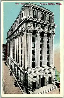 Architect Edward T. P. Graham designed the 10-story Boston City Hall Annex (1912-1914), and Burnham (Graham's Harvard classmate) was given the commission to model four colossal figures for its 9th story cornice.[3]