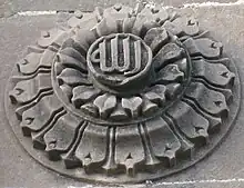 The mosque has decorative stone carvings featuring a sunflower motif and calligraphy engravings. One such carving is outside the Pesh Imam and features the word "Allah" in Arabic calligraphy. The merlons on top of the Shahi Mosque have the same carving. The sunflower motif is also on each side of the arches of the Shahi Mosque and the guard posts between each gate. There are round carvings of the Six Kalimas in Naskh script, surrounded by lilies, on the mosque's outer wall.