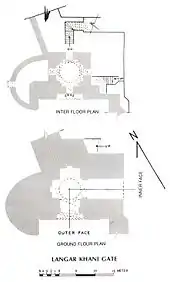 The gate may have been built in two stages.[1] It consists of an inner and outer gate that encloses a stepwell.[1] Its opening is 3.15 meters (10.3 feet) wide and is flanked by two bastions on either side. The gate has five battlements on top, with stairs leading up the outside wall. South of the gate is the Shahi Mosque, so many call it the Shahi Darwaza.