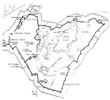 Rohtas Fort covers an area of 70 hectares (170 acres), enclosed by 4 kilometres (2.5 mi) of walls. It has bastion towers and twelve monumental gates that provide access to the inner fort.[5][2] The fort is an irregularly shaped triangle and follows the contours of its hill. The northwest corner of the fort is walled off from the rest of the structure by a 533-metre-long (1,749 ft) wall.[5] The enclosed section served as a citadel for elites.[5] It could hold up to 30,000 men.