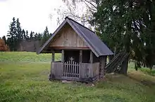 Rokina tsässon is a small, one-storied pine cross-beam building, has a square floor plan and a gable roof, the outer measurements of which together with the entrance-room are 390 x 230 cm. The beam part of the building is square (242 x 240 cm), surface area on the inside is about 3 m2. Tsässon has an open entrance-room (about 4 m2) with round logs that have slightly profiled angles that support the roof and about a metre high fence made from upright boarding. The gate is made from vertical fencing with the upper part of it arched. There is a cross on the highest fence board in the middle of the gate. The height of the building from the ground up to where the rafter and the wall unite is 160 cm and the height up to the ridge is 310 cm. The ridge has a simple wooden cross on it. The logs of the building are standing on granite stones and are tied in the corners by axe hewn halving. The dimensions of the door are 64 x 141 cm. The door is made up from three axe-hewn wide boards fixed on the crosspiece and painted over with red paint. The door opens on the inside. The vertical supporting posts are axe-hewn; the log above the door is hewn curved. The door is fixed on the supporting posts by forged 30 cm hinges that are not original. There is a cutting made inside the beams above the door for the entry icon. There are no windows. Originally, the building had a board roof, as can be seen from the raising-plate construction. During the last renovation, the eternit roof was replaced once again by a board roof. The eternit roof was put on the building after 1975; according to the Dr. Fr. R. Kreutzwald Memorial Museum 1974 notes (Kupp 1974) the building had a shattered board roof. It is also noted that in the earlier years, the tsässon was painted red, but the paint had worn out. The building on the photograph taken around the 1920s had no boarding, with the board roof leaning on lengthwise raising-plates and no entrance-room. There is a wooden Latin cross in the place of the former recess for an icon, under the gables in the upper frontal part of the building. In the 1974 photo, the building has an entrance-room that has been preserved up to today.[1]