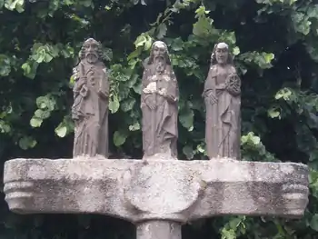For the south porch of the Saint-Yves church in Plounéour-Ménez, Doré executed two statues of John the Evangelist and Saint Thomas. He also worked on part of the calvary with back-to-back statues of the Virgin Mary and Saint Peter and John the Evangelist and Saint Paul.[21] The atelier also worked on the Kersimonet cross executing a statue of the Virgin Mary with child.[22] Finally in Plounéour-Ménez, the Dorė atelier are credited with execution of a calvary at the "manoir du Penhoat". On the fountain there Saint Francis of Assisi and Saint James the Greater's statues are all that remain of a calvary.[1]