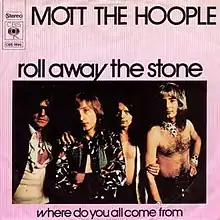 "Roll Away the Stone" is a song written by Ian Hunter, recorded by English rock band Mott the Hoople, and released as a single on the CBS label.[3] On the first version, recorded before Mick Ralphs left the band, Ralphs plays lead guitar and one of the Thunderthighs handles the bridge voice. It was re-recorded by the band for their 1974 album The Hoople, with Ariel Bender on lead guitar and English vocalist Lynsey de Paul singing the vocal bridge.[4]