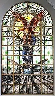 It depicts an image of a Royal Air Force fighter pilot at the centre, below which is an inscription. The young pilot is wearing a full fighter pilot outfit, complete with flying boots and a helmet which he holds in his hand. He is standing and looking over the Derby factory which made the engines required for his "survival and victory".[2] Below the pilot are also the blades of a propeller, behind which are the smokestacks of the factory. Above and behind the pilot is an eagle with outstretched wings, which is framed by the sun.[2][5] The window is 6.5 metres tall, 4.5 metres wide and since 2015 is lit up with 5,184 LEDs.[1][6]