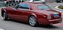 The Rolls-Royce Phantom Coupé is a luxury car manufactured by Rolls-Royce Motor Cars that debuted at the 2008 Geneva International Motor Show in Geneva, Switzerland, on 6 March 2008.[1] The platform is based on the 2003 Rolls-Royce Phantom and has styling heavily derived from the Rolls-Royce 100EX, a concept car unveiled to celebrate the company's centennial in 2004.[2] Its interior includes leather and wood veneer. There is a button to close the "coach doors" (suicide doors). The Phantom Coupe has the same 6.75-litre (412 cu in) V12 as found in the other Phantom models, developing 338 kW (453 bhp; 460 PS) of power and 720 N⋅m (530 lb⋅ft) of torque.[3] It is the first Rolls-Royce coupe in 22 years. It featured pillarless body construction making it a true 2-door hardtop, much like the popular hardtops from the United States in the 1960s.
