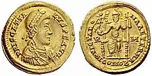 A solidus of Priscus Attalus with the phrase Roma invicta on the back