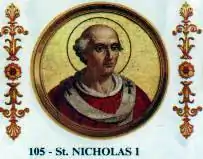After Nicholas ruled against him, Photius refused to react. He remained silent, neither denouncing the Pope openly nor acting as if anything had happened.[33] Michael sent Nicholas a strongly worded letter attacking papal primacy and the use of the Latin language. In Nicholas's response, he strongly defends the superiority of see of Rome as the only jurisdiction with immutable claims to apostolic tradition. He then invited both Ignatius and Photius to come to Rome to argue their cases, or to send proxies for this purpose.[34] But rivalry erupted at this stage in relation to the Bulgars. Khan Boris I fought the Byzantines in a short war that resulted in his capitulation and conversion to Christianity and promise to convert his people. On being refused a separate patriarch for these new Christians by Photius, Boris had invited Latin missionaries.[35][34] The delegation was led by the Bishop of Porto, the future Pope Formosus, who actively tried to convert the population to Latin Christianity. He denounced Byzantine customs of clerical marriage, the use of leavened instead of unleavened bread in the Eucharist, and the omission of the filioque in the Nicene Creed.[23][36] The mission was met with great success.[37] Boris asked that Formosus be made the Bulgarian archbishop. However, he was recalled to Rome by Nicholas.[38] Formosus was still serving as Bishop of Porto. Canon law forbade anyone from serving as bishop of two diocese at once, and Nicholas was unwilling to relieve him of his lower duties and give him a promotion.[36] Historian Johann Peter Kirsch has suggested that he viewed Formosus as a rival.[39]