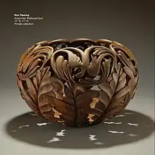 Example of Fleming's featured foliage motifs. Redwood burl wood, lathe turned, hand carved, 2011, Height 11 inches Diameter 17 inches