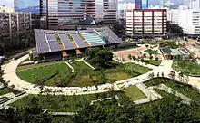 ZCB, a joint project of Ronald Lu & Partners and the Construction Industry Council and Development Bureau, is the first zero carbon building in Hong Kong, built in 2012 on Sheung Yuet Road, Kowloon Bay Industrial Area.[6] It costs HKD $240 million, covering a total area of 14,700 square metres of land, comprising a three-storey building and a landscape area. It houses seven zones: indoor exhibition and education area, eco-home, eco-office, eco-café, multi-purpose hall, eco-plaza, outdoor exhibition areas and Hong Kong’s first urban native woodland. 90% of the site area covers with plants, served as recreational use, 60% of which is planted with local vegetation.