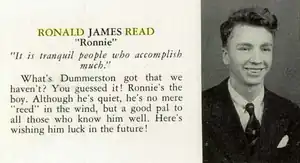 Read was born on October 23, 1921, to George and Florence Ray Read[1] into an indigent family that managed a farm.[2] He was raised in Dummerston, Vermont, in an extremely tiny house.[3] To travel to high school, he daily walked and hitchhiked 4 mi (6.4 km) to Brattleboro.[2] Read graduated from Brattleboro Union High School in 1940[2][3] and was the first high school graduate in his family.[4] He had an older brother, Frank.[2] During World War II, he enlisted in the United States Army[2] and was deployed to North Africa, Italy, and the Pacific Ocean theater.[3] In Italy, he worked as a military policeman.[5] He reached the Army rank of technician fifth grade.[1] Right before Christmas 1945, he finished his deployment, was honorably discharged, and traveled back to Brattleboro.[3][6]