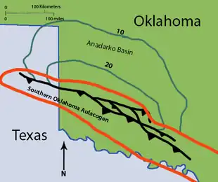 - 1 2 McConnell, D. A.; Gilbert, M. C. (1990-03-01). "Cambrian extensional tectonics and magmatism within the Southern Oklahoma aulacogen". Tectonophysics. Heat and Detachment in Continental Extension. 174 (1): 147–157. Bibcode:1990Tectp.174..147M. doi:10.1016/0040-1951(90)90388-O. ISSN 0040-1951.