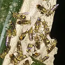 Ropalidia is a large genus of eusocial paper wasps (Polistinae) in the tribe Ropalidiini distributed throughout the Afrotropical, Indomalayan and Australasian biogeographical regions. The genus Ropalidia is unusual because it contains both independent and swarm-founding species.[1] Ropalidia romandi is one of the swarm founding species, meaning that new nests are founded by a large group of workers with a smaller number of inseminated females (egg-laying foundresses),[2] while Ropalidia revolutionalis is independent-founding, meaning that each nest is founded by a single foundress.[3]