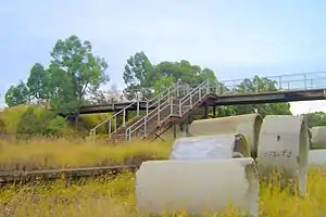 In April 2011, the stairs were removed and the railings on the footbridge made good. The stairs had been the standard pattern pre-cast concrete on steel framework, and had weathered to the point where the concrete was crumbling. The old platform retains its former appearance and there is a park on its northern side. At one stage, the rail formation and yard area at the western end of Dunheved station were used by a local company for the storage of concrete pipes.