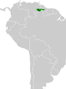 It is found in humid forest associated with the Tepuis of south-eastern Venezuela, Guyana and far northern Brazil (northern Roraima only). Although generally uncommon, it is considered to be of least concern by BirdLife International.[1]