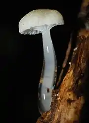 The fruit bodies (mushrooms) have several distinguishing characteristics that facilitate identification, including thick, white, mucilaginous stipes, and white to pale cream, convex caps that measure 1–2 cm (0.4–0.8 in). The gills are white, widely spaced, and have a fused or decurrent attachment to the stipe. Spores are smooth, ellipsoid, and measure about 9–15 by 6–9 micrometres. The smooth and white stipes are 4–6 cm (1.6–2.4 in) long and 0.1–0.2 cm (0.04–0.08 in) thick, and covered with a thick coating of gluten.
