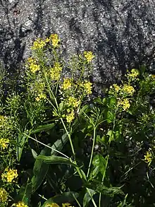 Rorippa austriaca is a species of flowering plant in the family Brassicaceae known by the common names Austrian yellow-cress[1] and Austrian fieldcress. It is native to parts of Europe and Asia, and it is known in North America as an introduced species and sometimes a noxious weed. It can grow in disturbed habitat, such as roadsides, and in very wet habitat such as mudflats. It is a perennial herb growing upright to erect, reaching a maximum height near one meter. The branching stem bears hairless blue-green lance-shaped leaves up to 10 centimeters long. The bases of the upper leaves clasp the stem. The inflorescence is a raceme at the top of the stem and the ends of stem branches. The mustardlike flowers have small yellow petals. The fruit is a plump silique a few millimeters long, but many plants do not fruit and seed production is rare. Reproduction in this species is more often vegetative, the plants concentrating their growth in belowground tissue and spreading clonally.[2] The root system of the plant is particularly aggressive, sending up many new plants as it spreads.[3]