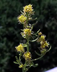 The inflorescence is an elongated raceme occupying the top portion of the stem containing many tiny yellow flowers just a few millimeters long.