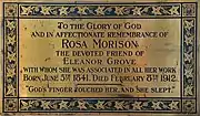 Morison died in University College London in 1912. Her funeral was very well attended and her bequest was used to establish a scholarship at the college.[2] In 2018 a new hall of residence was named Eleanor Rosa House to commemorate the contribution of Rosa Morison and Eleanor Grove to women's education.[4] The building has 33 floors and capacity for 500 students. The interior design is inspired by Rosa and Eleanor.[6]