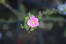 Rosa stellata is a species of rose known by the common names desert rose,[1] gooseberry rose, and star rose. In Texas this type of rose grows on dry rocky places to 6,500 feet (2,000 m), such as the Trans-Pecos. It occurs in the mountain canyons of Arizona and New Mexico. It also grows in dry, rocky places.[2] It has trifoliate leaves, deep rose purple blossoms and yellowish white prickles on the petioles and stems. It is a perennial shrub with velvety, deciduous leaves.[2] Some horticulturists consider it to be a browse plant.[3]