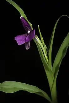 Flowers appear in July to August in the wild. The stem (peduncle) of the flower spike (inflorescence) is either held within the leaf sheaths or sometimes slightly extended from them. The flowers usually open one at a time and are purple or white. The ellipse-shaped bracts which subtend the flowers are 3.3–7 cm (1.3–2.8 in).[2]