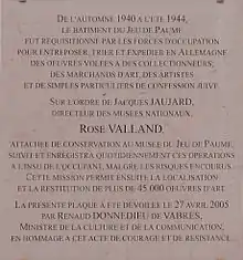 On the initiative of the Association de la Mémoire de Rose Valland, a commemorative plaque honoring Valland was unveiled on 25 April 2005 on the façade of the Jeu de Paume.