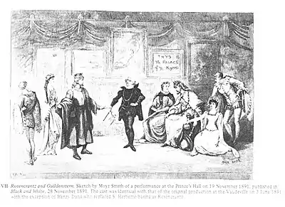 Gilbert's play first appeared in Fun magazine in 1874 after having been rejected for production by several theatre companies.[1][2] The first professional performance of the work was not until June 1891, a benefit matinée at the Vaudeville Theatre in London.[3] The play finally ran at the Court Theatre from 27 April 1892 to 15 July, about 77 performances,[4] with Decima Moore as Ophelia, Brandon Thomas as Claudius and Weedon Grossmith as Hamlet.[5] An amateur performance in 1900 featured P. G. Wodehouse as Guildenstern.[6] The play also enjoyed a production in New York City at the Murray Hill Theatre in 1900. A charity performance in 1902 featured Gilbert himself as Claudius, with Nancy McIntosh as Gertrude.[7] Gilbert again played Claudius at a charity performance in 1904 at the Garrick Theatre (also featuring Clo Graves, Francis Burnand, Edward Rose, Paul Rubens, Lady Colin Campbell, Madeleine Lucette Ryley, Col. Newnham Davis, Alfred Sutro, Alicia Ramsey, Edward Rose and Capt. Robert Marshall)[8][9][10] and in a 1908 revival at the Lyceum Theatre starring Marion Terry.[11]